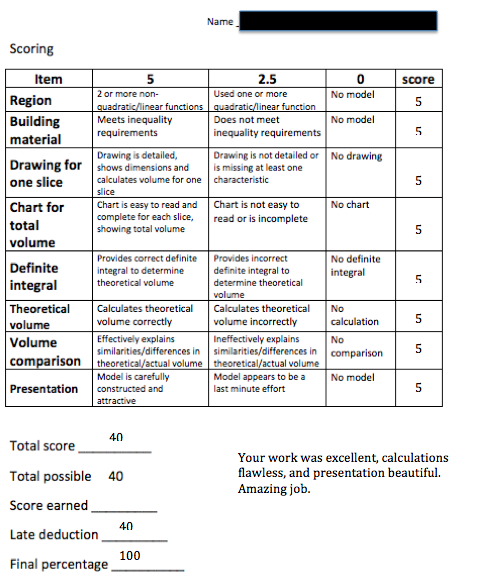 I have attached the test I gave for Unit 3 in Calculus. It is valid because it measures the students knowledge of this unit clearly, has items to measure each standard and has all levels of difficulty. It has high security because it was created using secure AP questions, there were multiple versions, and I use extreme test security in my class room. This requires no cell phone usage while students are taking the test or while we go over the test afterwards. The results were normally distributed, as they should be, showing the reliability of the exam.