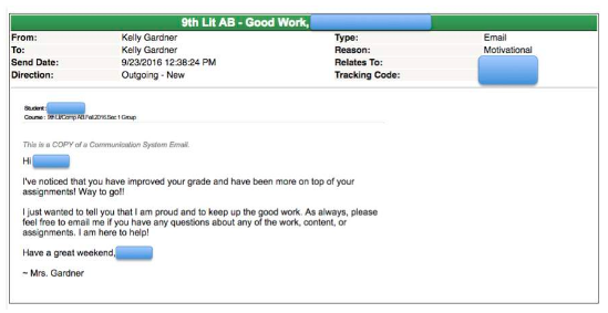 This is a motivational email to a student that perhaps was failing in the course but is now doing a good job.  This is a great tool to say to a student I see your hard work and keep it up. The teacher will be able to see a direct correlation between motivational email communication and passing the course. Teachers who utilize data to drive instruction have a distinct advantage over those who do not because they can make changes to their course and communication in order to increase student achievement.